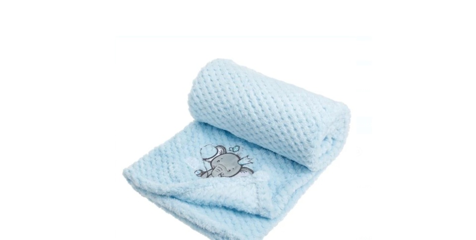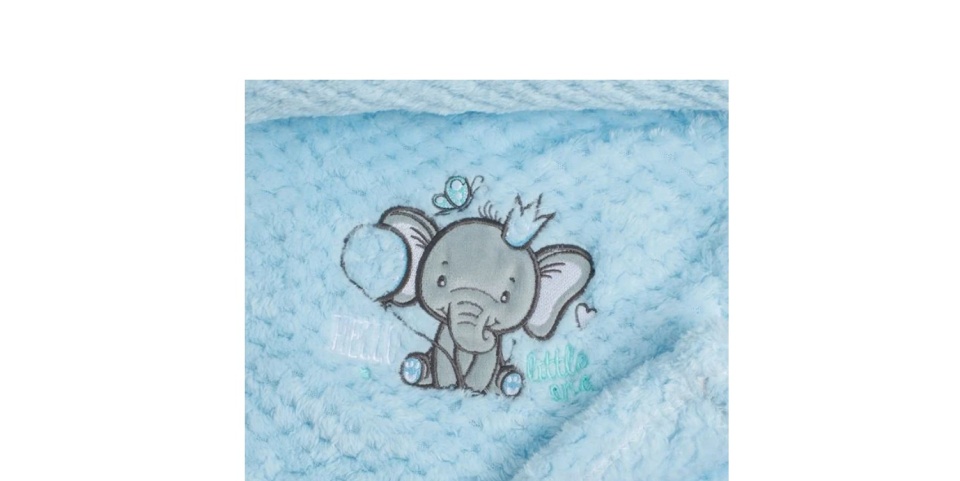 Patura bebe pentru fete, cu textura moale tip pop corn si broderie cu elefantel gri. De culoare ciel, cu doua fete. Este ideala pentru plimbarile micutului in primele zile reci, fie in portbebe, fie in carucior!