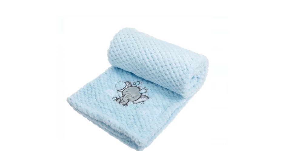 Patura catifelata pentru bebelusi, model brodat, dimensiune 100x75 cm, Albastra cu elefant.