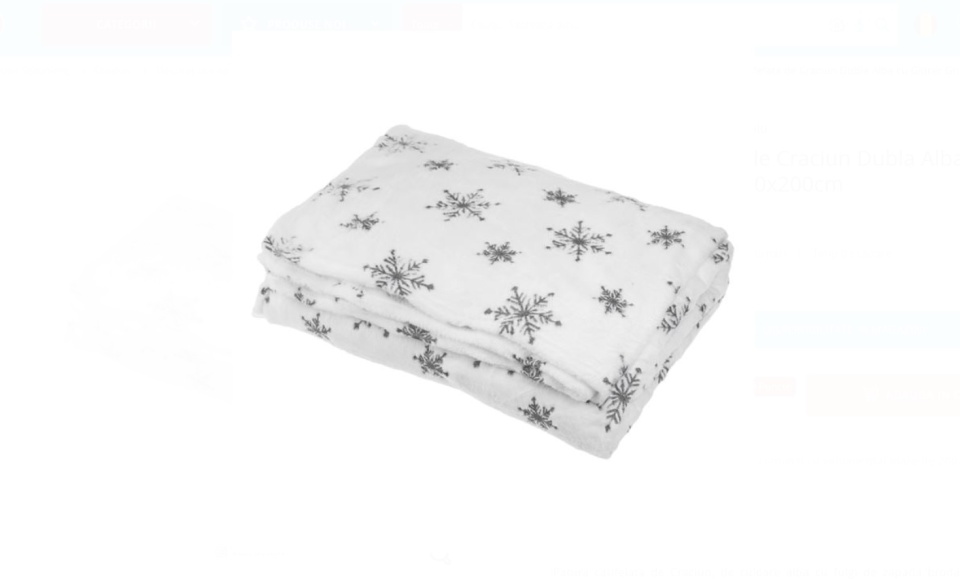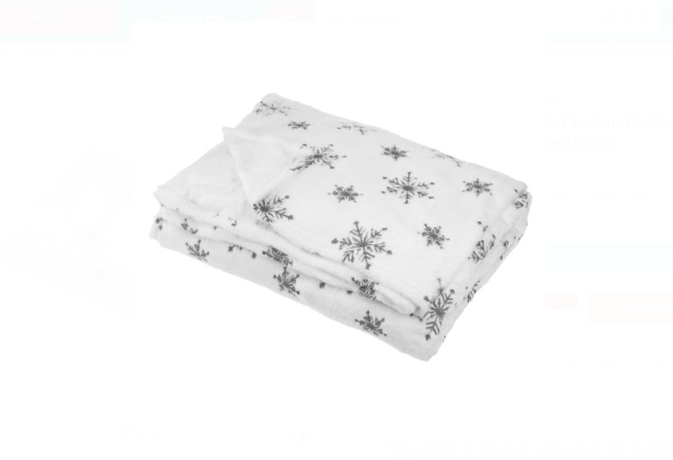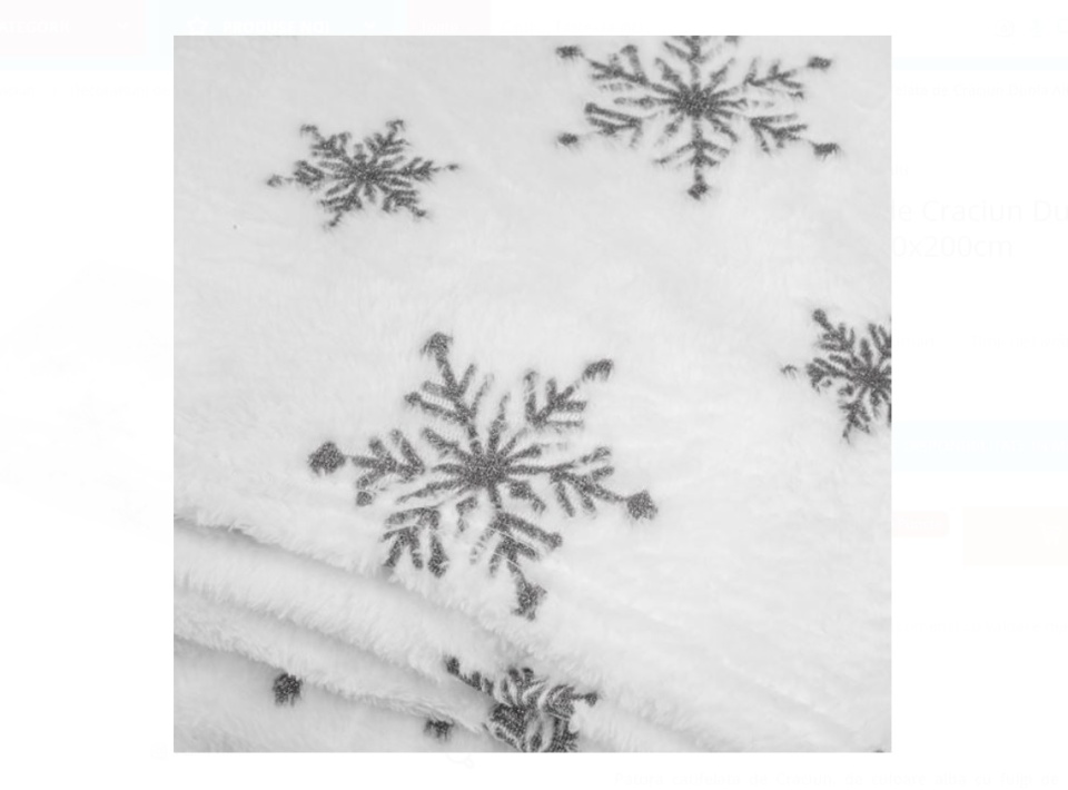 Patura catifelata de Craciun, de culoare alba cu fulgi de zapada brodati cu glitter gri argintiu.